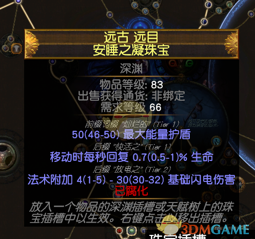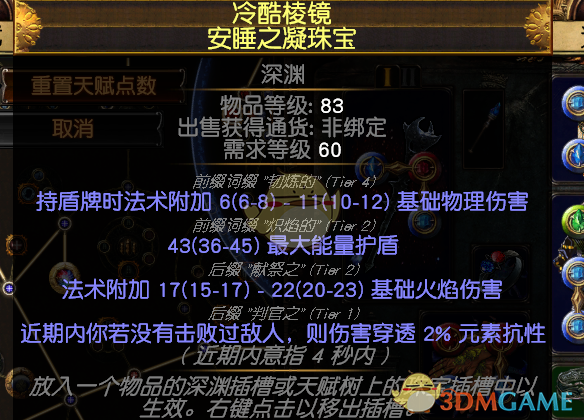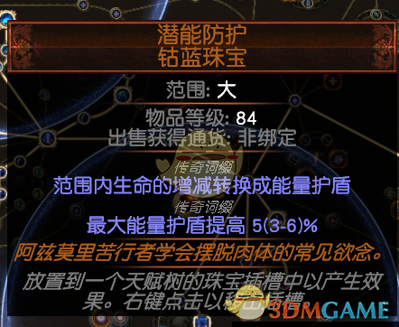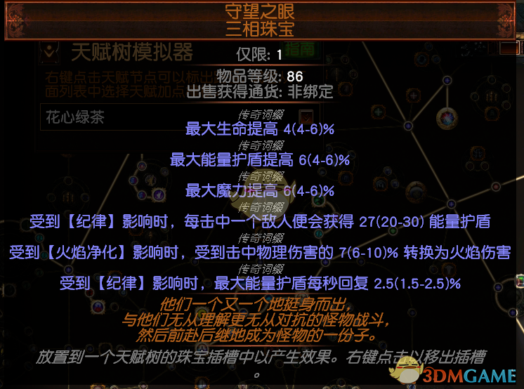 三项珠宝是加强生存很重要的一个点,最好是两个上面这种纪律属性的加一个清晰魔力转ES的,这样的话护盾能上1W2。这个我8E买的,多一条火焰净化,没有火焰净化的5E。如果要便宜就单买一个纪律击回的,1E左右。