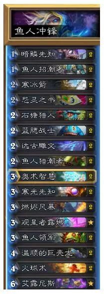 30张卡牌基本是没有可替代的,2先知、2招潮者、2蓝腮、2猎人、2猎潮、2寒光、2领军一共是12张鱼人卡牌,算上2巨壳龙,这便是主要的进攻手段。