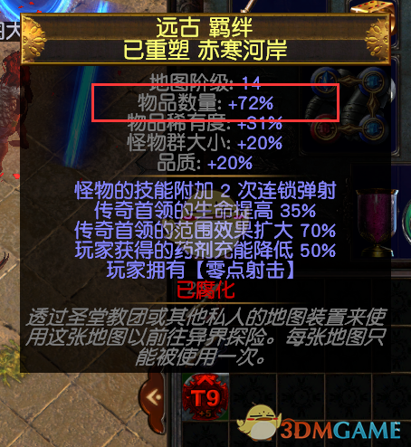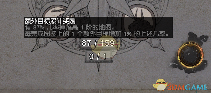 如图,完成87个额外目标后,奖励是有87%机率把掉落的地图提高1阶。