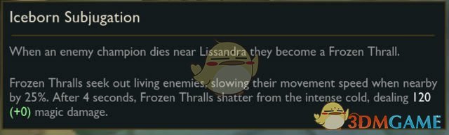 冰霜奴役会自动寻找附近存活的敌方单位,靠近冰霜奴役的敌方单位会被减速25%。在4秒之后冰霜奴役会破裂,对附近的敌方单位造成120(+?AP)点魔法伤害。