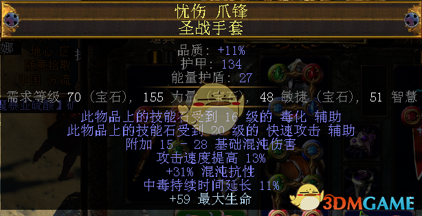 手套:毒化+快速攻击 双技能长老手 +生命和+混沌抗性必须其它随意 技能连法:熔岩之击20-先祖20-多重20-击中回复20