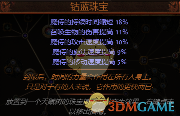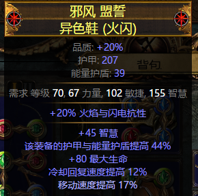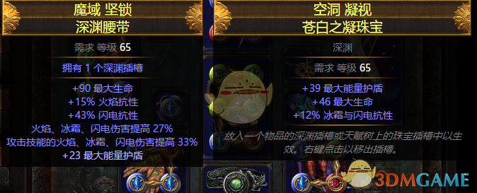带冷却词缀的塑界腰带或鞋子。尘埃落定凑齐后,需要一条“冷却回复速度提高”的词缀,至少是12%,目的是缩短“受伤时释放”的冷却时间,从0.25s缩短到0.23s,使得骷髅自爆能触发召唤骷髅、灵魂奉献、亵渎之矛等技能,从而实现永动。至于选鞋子好还是腰带好,主要是看其他属性的需求,我自己找到一个塑界的异色鞋,血量抗性都有,这种情况下选择了深渊腰带,获得高血量、元素伤害和抗性,同时配以生命、护盾、抗性的深渊珠宝。