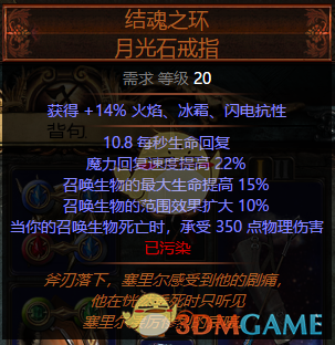 结魂之环。自残核心装备,每个召唤物死亡造成350物理伤害,配合召唤升华达到每次3个骷髅自伤528+,触发受伤释放。其他属性无要求。因为我选择了电甲,比较缺抗性,因此选择了瓦出加全抗的指环。市场产量非常大,价格便宜。