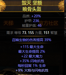 由于攻击技能放在武器上,头部不绑定元打头,我认为最佳选择是地心词缀的唤骨头。召唤物增伤可以作用于自身,地心词缀可以带来高血量,极品是“周围敌人降低火焰抗性”的词缀。其他属性补抗、补敏捷即可。我用的这个除了血高外没有什么特点,很便宜。