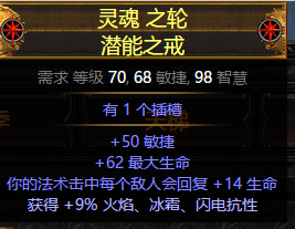 塑界戒指:带法术击回的戒指,在自残流的自动高频法术hit下极大的增强回复能力,刷图更安全,站撸更稳。可以选择生命版本(珊瑚)、抗性版本(若干种)或者潜能戒指(带孔)。属性补血补抗补敏为主,也可以选择攻击词缀。我自己选择了带孔的潜能戒指。