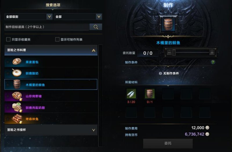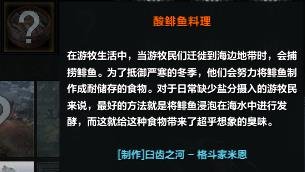 收集好材料可以制作料理前置材料在木桶里的鲱鱼,在地图标记左侧区域使用概率获得正在发酵的鲱鱼,等待5小时后就可以使用变成酸鲱鱼料理。