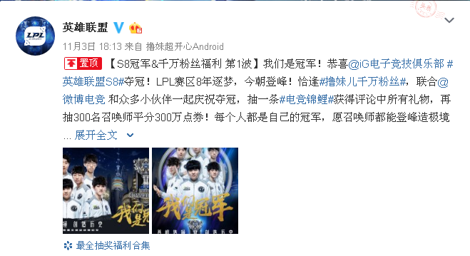 为庆祝iG电子竞技俱乐部英雄联盟S8夺冠!LPL赛区8年逐梦,今朝登峰!英雄联盟官方微博联合微博电竞和众多小伙伴一起庆祝夺冠,抽一条电竞锦鲤获得评论中所有礼物,再抽300名召唤师平分300万点券!