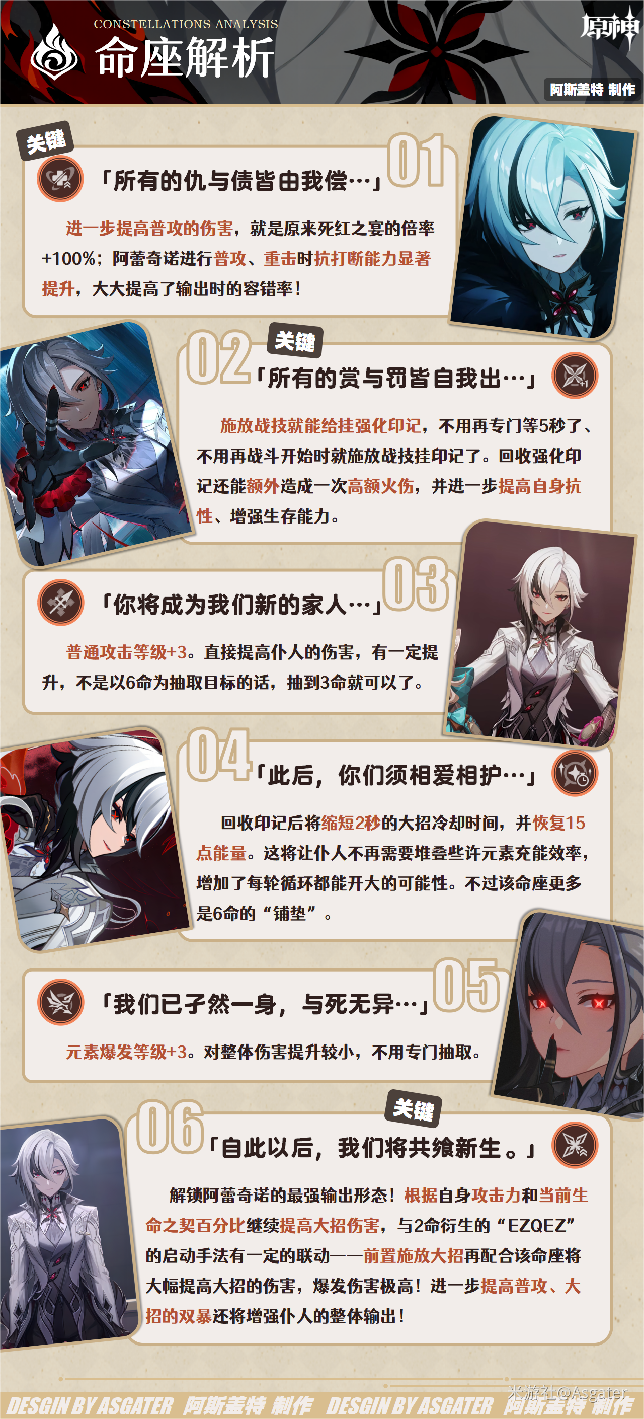 ◆总的来说,0命阿蕾奇诺就已经具备了很强的输出能力,在各种流派玩法中都有可观的表现,命座会进一步为阿蕾奇诺“锦上添花”——如果想要抽取命座,可以1、2、6命座为抽取目标。