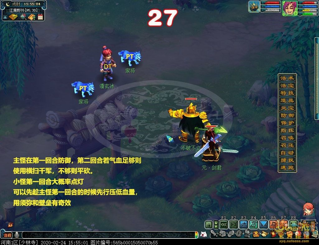 主怪第一回合防御,第二回合若气血足够则使用横扫千军,不够则平砍。