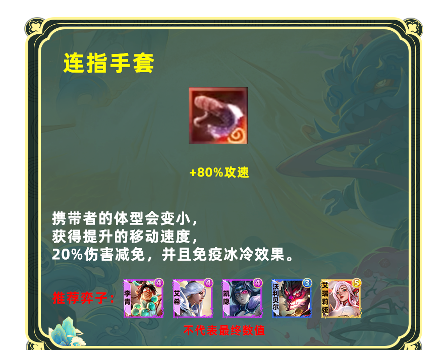 加强版单体小而致命。80%的攻速能完美取代羊刀/启动装的位置。而缩小体型和移速提升更适合战士单位。