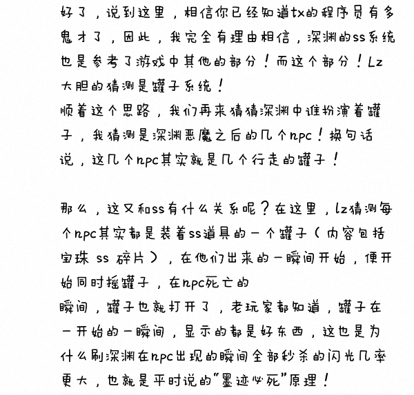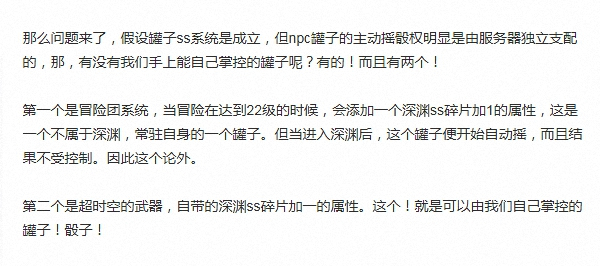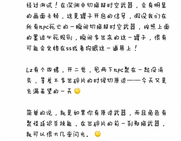 看来说到这里,相信你们有点半信半疑了,看得出程序员是有多鬼才了,不过玩家还有理由相信,深渊的SS系统也是参考了游戏中其他部分,而这个部分是罐子系统!最好就是如果你有原谅色武器,而且角色有聚怪延迟杀技能,再出碎片前换武器,就可以很大几率闪光。
