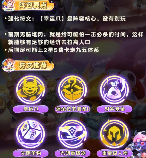 阵容前提:必须要有【幸运爪】,技能造成250%伤害,并且有100%几率掉落1金币(只有最强大的才有,多个可酷伯无效)