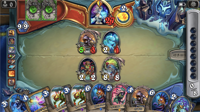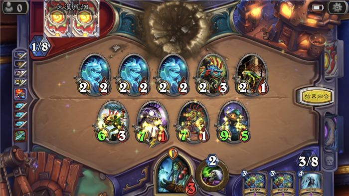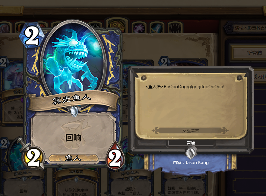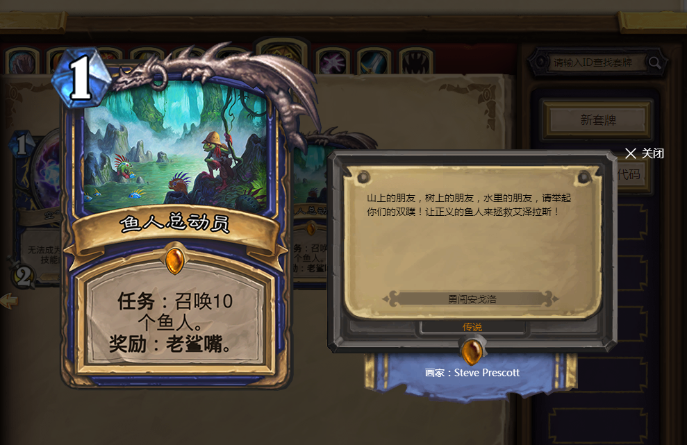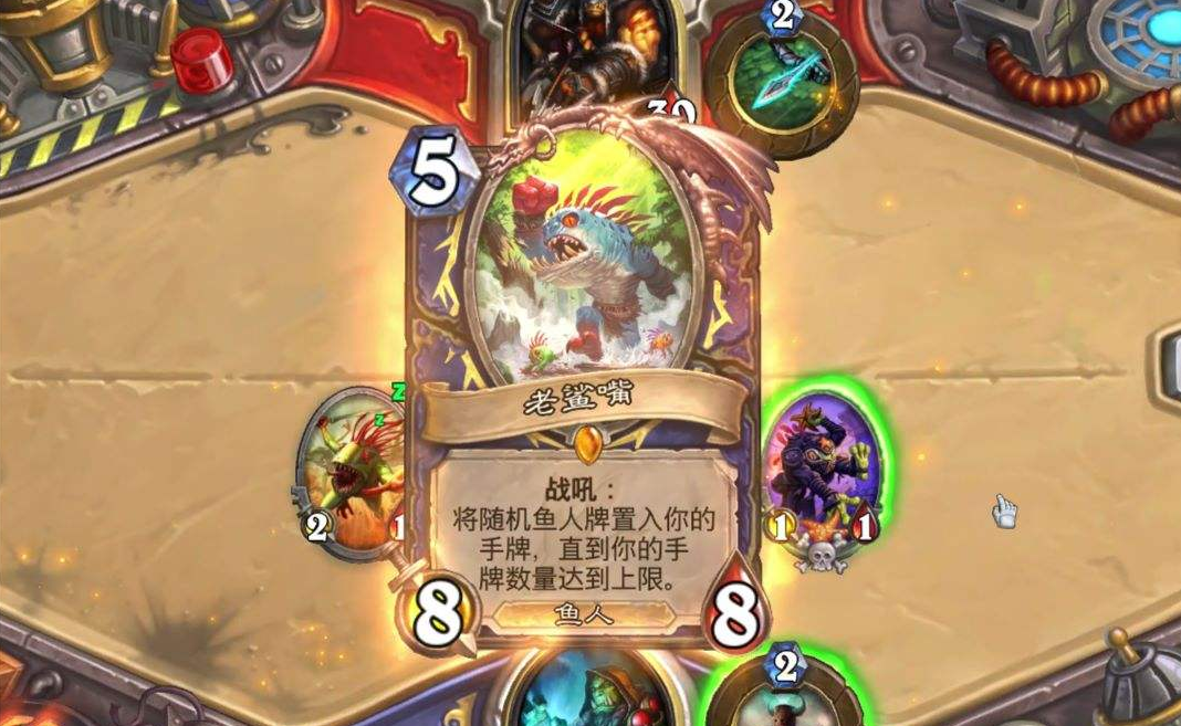 开局之后对战双方都会自动挂上萨满的任务“鱼人总动员”,效果为召唤10个鱼人就奖励“老鲨嘴”,“老鲨嘴”588的身材还能将随机的鱼人卡牌填充你的手牌,可以说十分给力了。