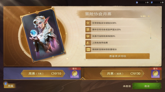 玩家购买周票/月票后,在生效期内可开启随身仓库功能,副职制造精力降低10%,日常获取战令经验加30%,事件日常任务奖励声望加20%,塔瑞斯宝箱掉落数量增加。