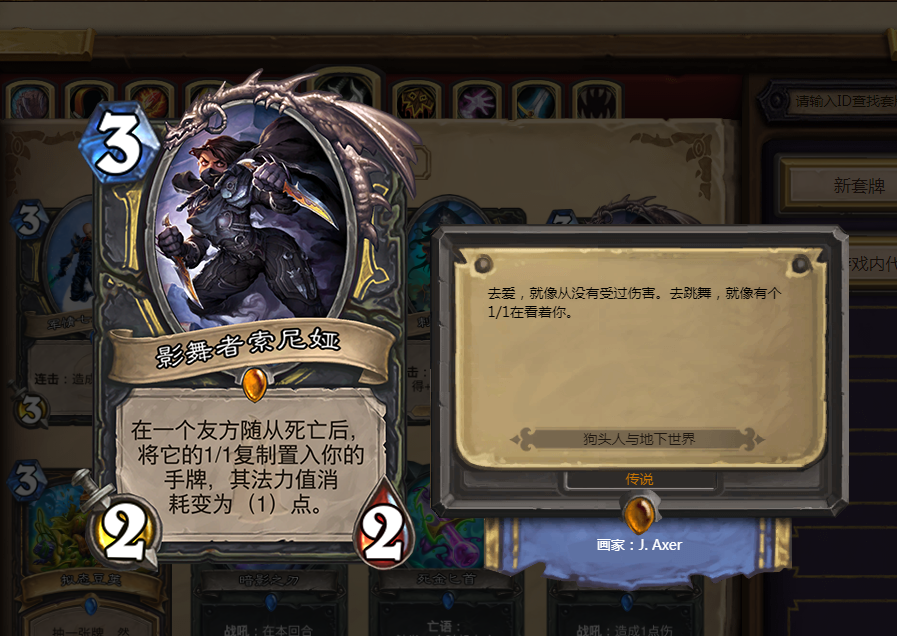由于我们随从的亡语效果都是非常强力的,所以配合上影舞者可以给我们带来更大的收益,特别是像白银先锋这一类的高费亡语随从,如果直接裸下,就算其亡语效果非常imba,也是非常亏节奏的,但如果是用影舞者回手的白银先锋,我们可以只用一点费用就把他召唤出来,这样我们就能花费最低的代价得到最大的收益。在实战中,我们最好是在送掉魔块的回合召唤影舞者,因为我们牌组中主要依靠的就是魔块的效果,这是能为我们带来极大优势的一只随从。