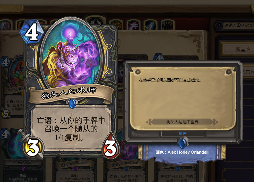 这张卡的亡语效果非常有意思,召唤我们手牌中一只随从的复制,看起来只是召唤一个身材残疾的随从,但别忘了我们是亡语贼,这就意味着我们有着很亡语随从,如果运气好狗头人幻术师的亡语给我们召唤了一个白银先锋的复制,那我们可以配合魔块死金药剂快速拉出来好几只八费随从,极大的加强我们的场面。