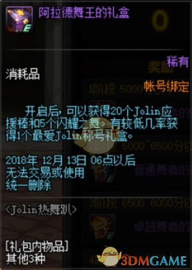 第四阶段是阿拉德舞王礼盒,想要获得这个奖励分数最少是8千分以上,打开这个礼盒可以获得20个Jolin应援棒和5个闪耀之舞,并且有较低的几率获得1个【最爱Jolin】的称号礼盒,这个称号与商店兑换的是一样的。