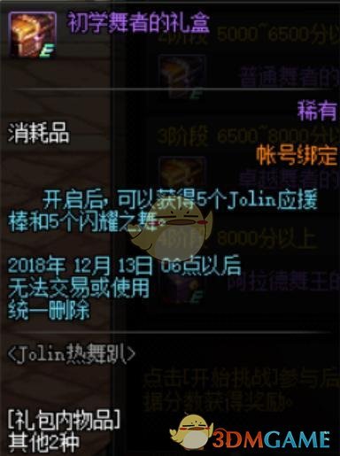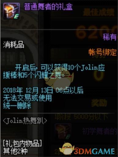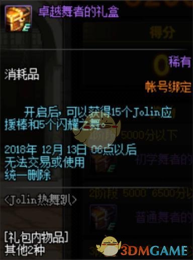 第一个分值段是5千分值以下,也就是大家点击这个游戏不玩也能获得的奖励,初学舞者礼盒内有5个Jolin应援棒和5个闪耀之舞,这两个是材料和消耗品,后面我会说明怎么使用。