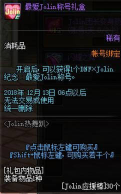 30个应援棒可以兑换到【最爱Jolin】称号,这是一个DNF和Jolin的纪念称号,暂时不知道是否是账号绑定,我还没有换出来,也不清楚属性是怎样的,不过一般纪念称号我觉得都是无属性的多。