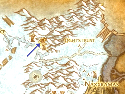 光明的复仇位于龙骨荒野东北部的霜之哀伤洞穴内,靠近光明之誓。在接近阿尔萨斯的锤子时,巫妖王会出现并召唤大量食尸鬼。杀死食尸鬼后点击锤子,会召唤一个精英僵尸,杀死他后获得光明的复仇。