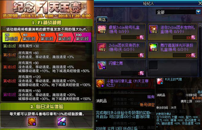 热舞派对是主题活动,会送绝版光环和称号,还有街头热舞的玩法值得期待一下,天王赛纪念活动的实际作用更大些,会送斗兽场印章,还有使用疲劳值的buff,加成非常高三速+20%,四维加了100多点,跟日常药剂不冲突的。
