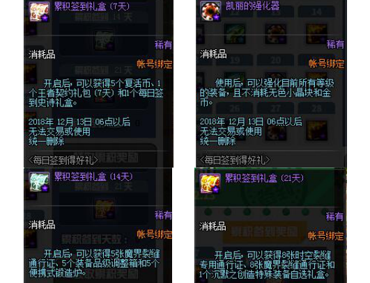 签到活动送出的深渊票一共25张,还有5个锻造炉、4个强化器和5个装备品级调整箱,累计活动中7天会送200个85史诗碎片,累计21天的礼盒是卢克传说装备,可以用来升级海伯伦。