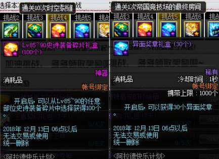 这种活动形式之前出过不少次,但今年是首次推出,会送90史诗碎片100个,还有许多帝国竞技场材料,推荐首先挑战这两部分奖励,也就是挑战四和挑战五,其它的诸如深渊票、经验药和契约用处不大。