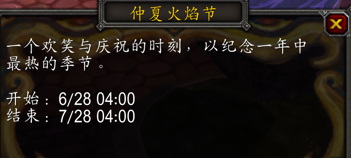 正常情况下魔兽世界仲夏火焰节举办时间是6月21日至7月5日,这样留给国服玩家的时间满打满算也只有9天,好在国服官方特地把今年的仲夏火焰节时间改为了6月28日至7月28日,这样即使是新玩家也能有充分的时间获得仲夏火焰节的节日奖励。