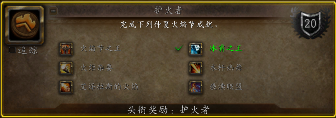 成就党玩家也可以继续做“千奇百怪的漫长旅行”这个魔兽世界经典成就了,它由春节、情人节、复活节、儿童周、仲夏火焰节、美酒节、万圣节和冬幕节八个节日大成就组成。“千奇百怪的漫长旅行”成就不仅奖励310%飞行速度坐骑紫色始祖幼龙,还会赠送给没有大鸟骑术的玩家大鸟骑术,其中仲夏火焰节所需成就为"护火者"。