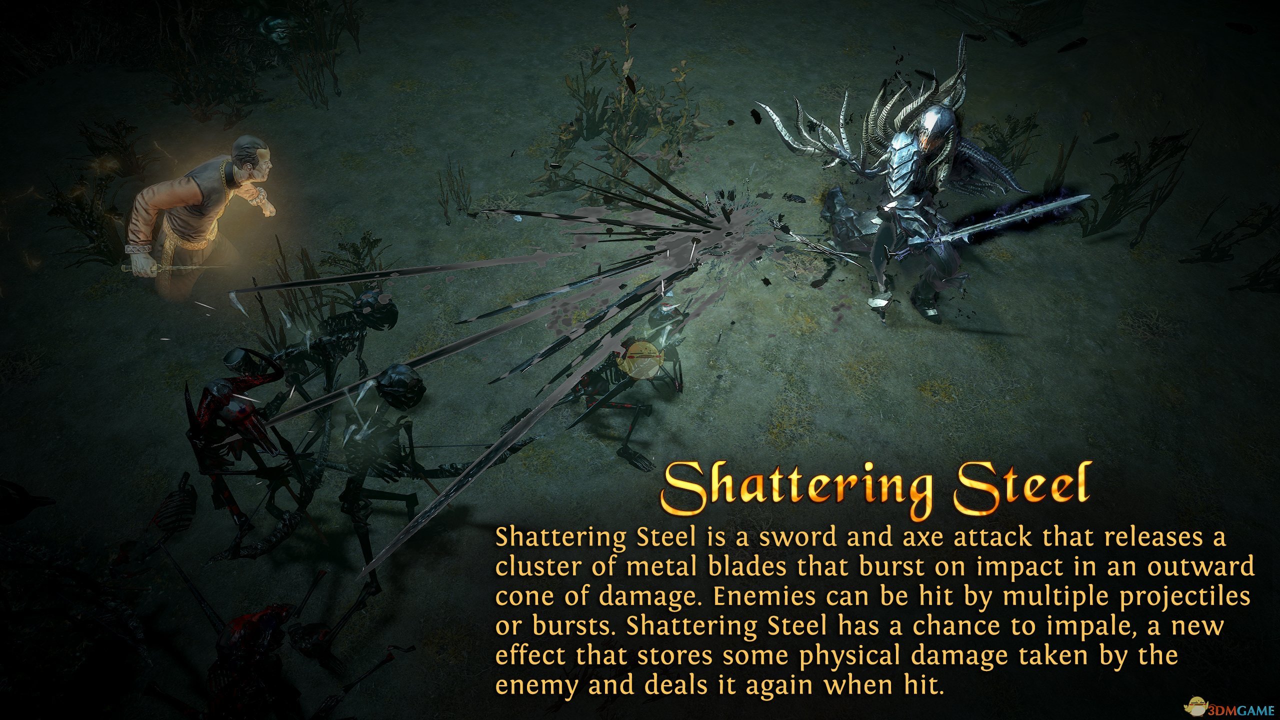 限定剑&斧.朝地面锥形范围射出多个金属碎块,敌人可被多个投射物同时伤害到(我听见EK在哭). 破碎钢铁击中时有机率使敌人获得新debuff:穿刺.当下的%物理伤害在下次被击中时再次伤害.