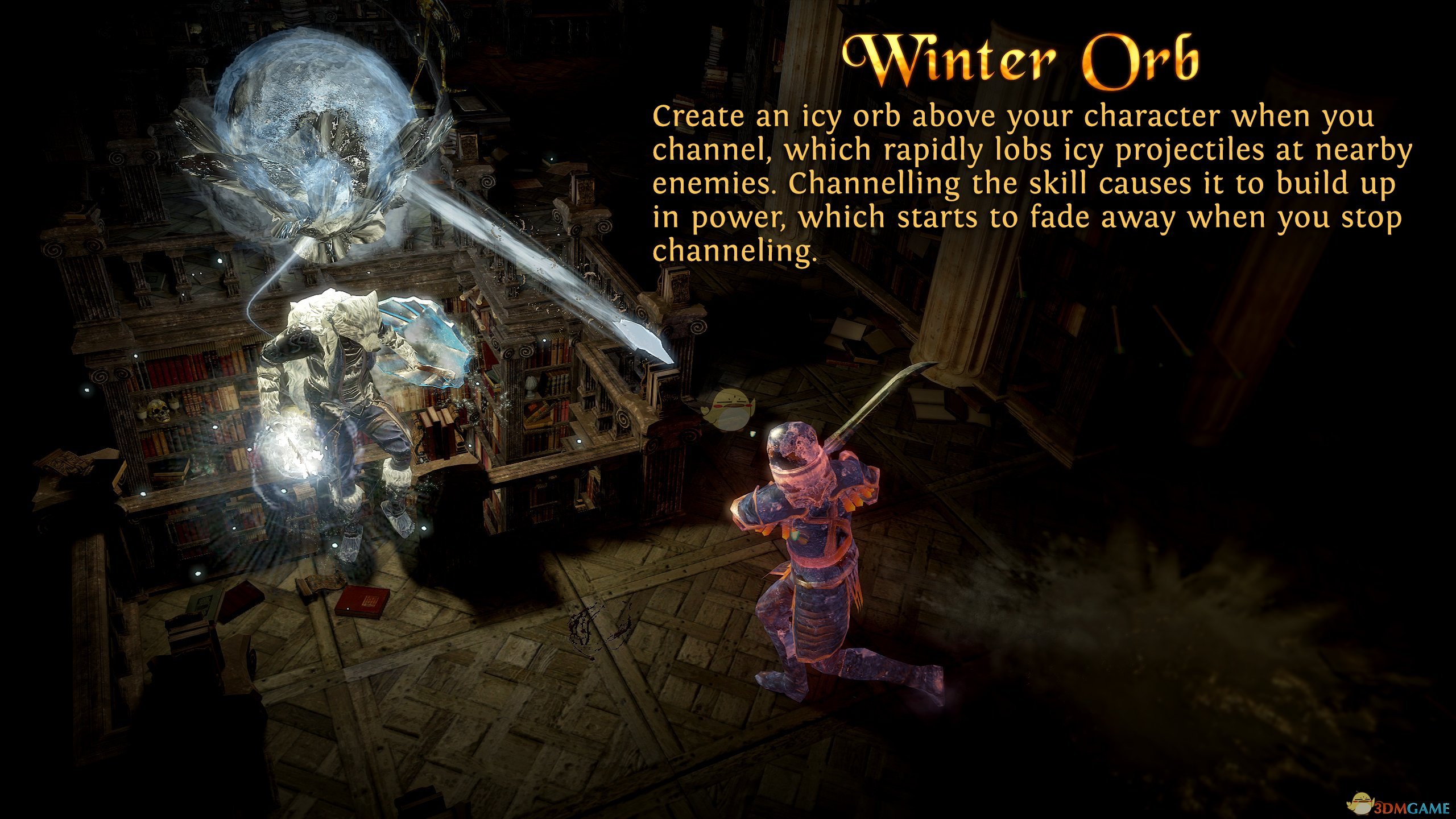 在你角色头顶引导一颗冰球, 这颗冰球会迅速的对周围敌人投射冰投射物. 持续引导技能会增强伤害, 停止引导时则伤害衰退.