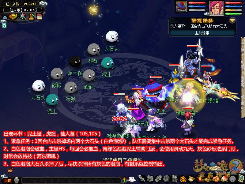 1、紧急任务:3回合内击杀掉场内两个大石头(白色泡泡),队伍需要集中击杀两个大石头才能完成紧急任务。