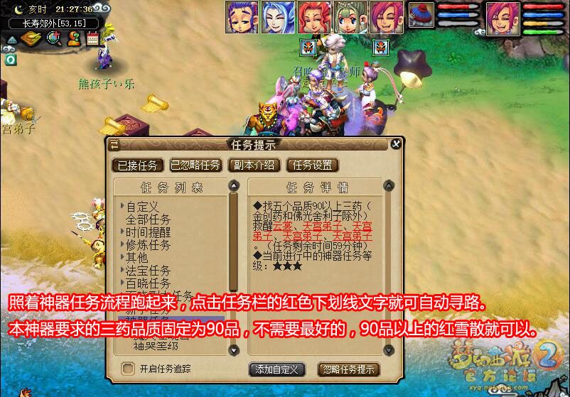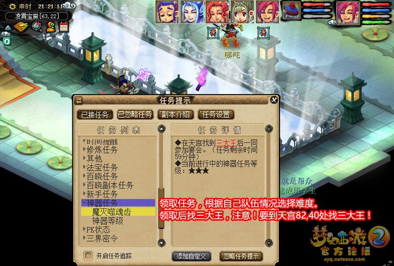 注意事项:1、本神器难度为★★★,为神器任务·转。任务领取后找三大王,去天宫(82,40)找三大王,不是去狮驼岭找。
