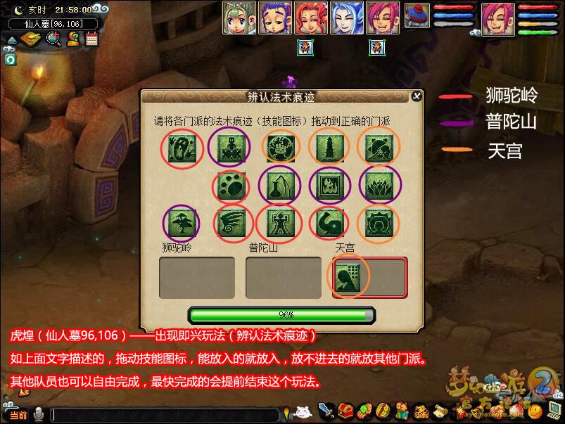 虎煌(仙人墓96,106)——出现即兴玩法(辨认法术痕迹),如上面文字描述的,拖动技能图标,能放入的就放入,放不进去的就放其他门派。其他队员也可以自由完成,最快完成的会提前结束这个玩法。