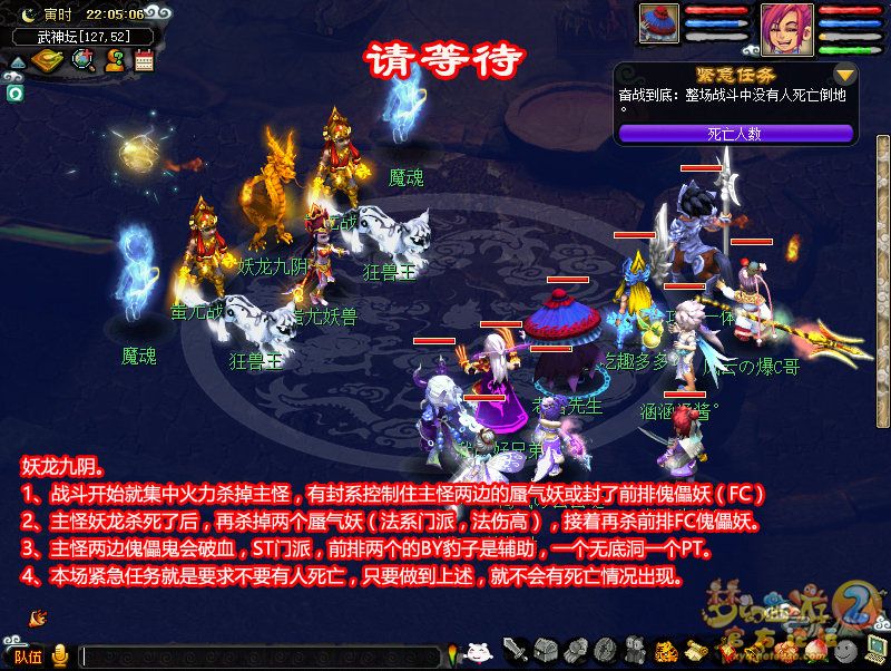 2、主怪妖龙杀死了后,再杀掉两个蜃气妖(法系门派,法伤高),接着再杀前排FC傀儡妖。