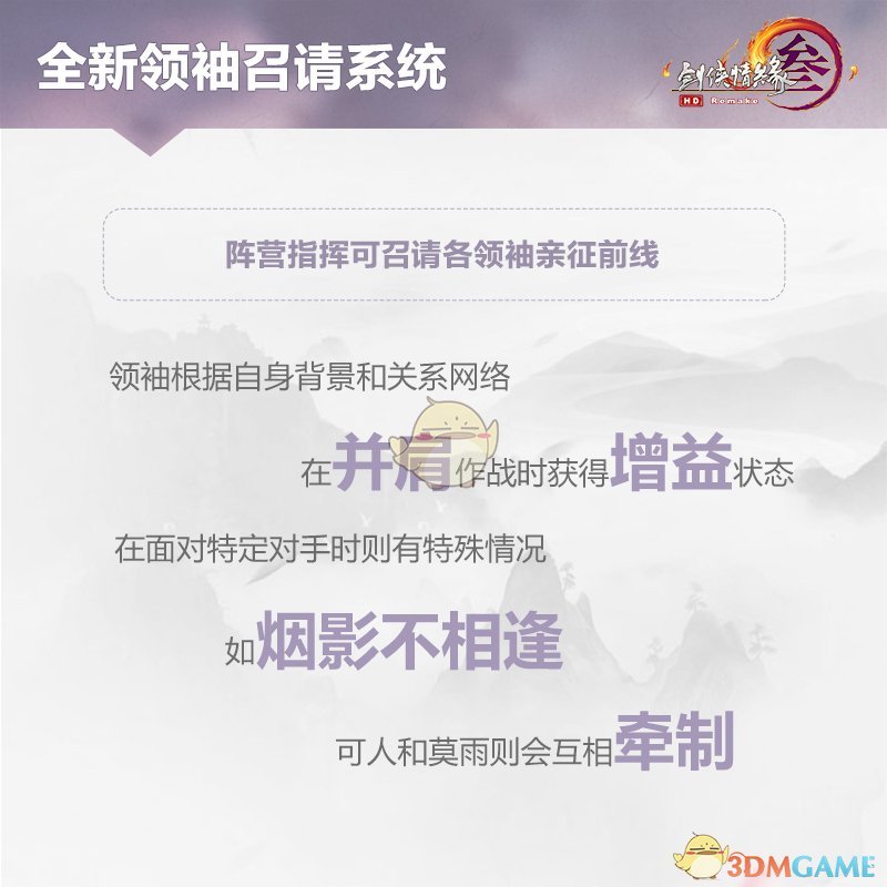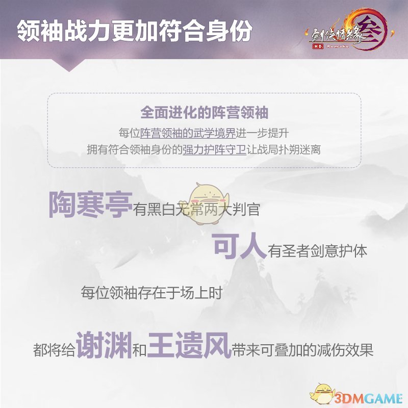 全面进化的阵营领袖机制,每位阵营领袖的武学境界进一步提升,强力护阵守卫让战局变得扑朔迷离。领袖作战时,会自己确立作战方针,不再被轻易的挑拨就脱离战斗了。当阵营指挥在竞选成功后,将获得限定的指挥车,并拥有对应的指挥技能,可召请本阵营的强力领袖亲征前线,帮助己方进行战斗。每位领袖都根据角色背景和关系网络,在并肩作战时获得增益状态,在面对特定对手时则有特殊情况,例如烟影从不相逢,可人和莫雨则会互相牵制……