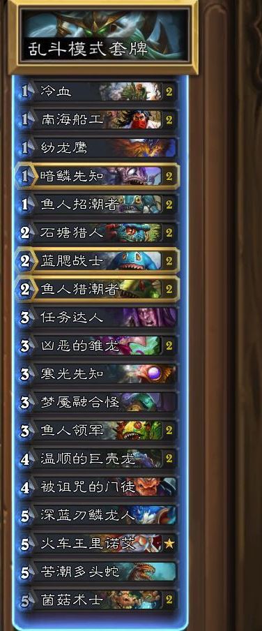 初看这个新乱斗还是感觉不是很合理,快攻的卡组非常有优势,先手有巨大的优势,卡组可以试着带上凶恶的雏龙,三费能隐藏一回合基本稳了。下面给大家分享一下几个高胜率卡组。