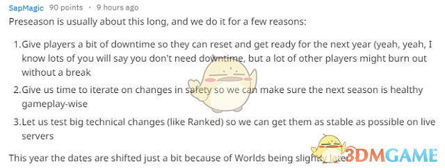 首先,他们希望给予玩家一些休养调整的时间,让他们可以为明年的排位赛重置做好准备。当然,有些玩家表示他们不需要休赛,但大部分的玩家还是希望可以暂时小憩一下。其次,季前赛可以预留足够的时间来让游戏团队进行更多安全性的改动,确保下一个赛季开始时,游戏处于一个健康的玩法。