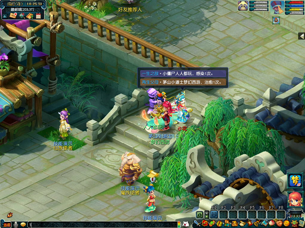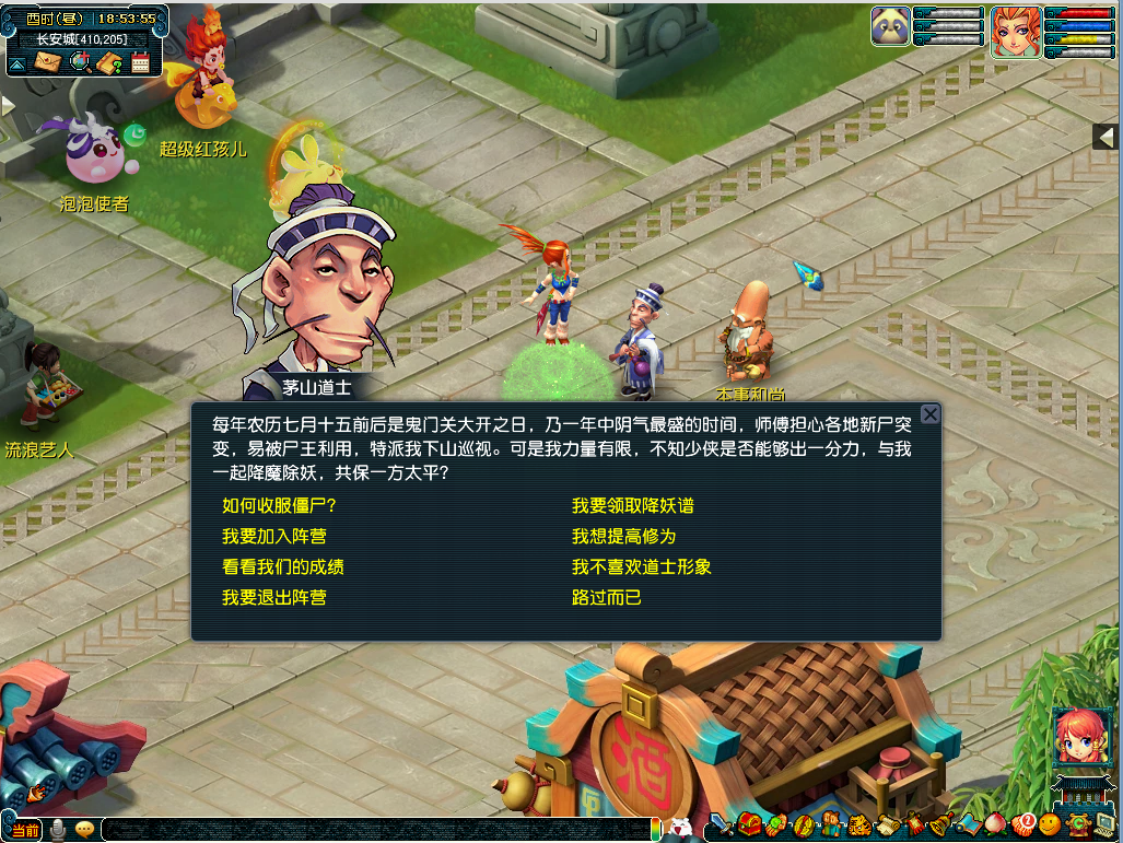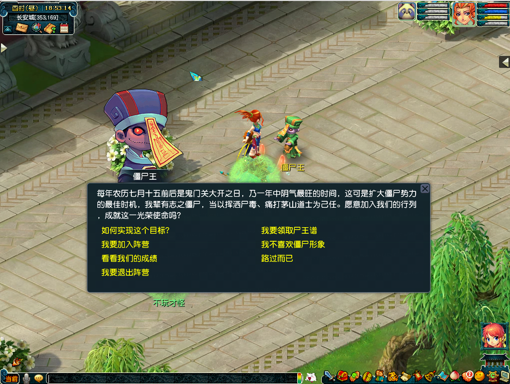 活动期间,各位少侠可在长安城(356,172)寻找僵尸王加入僵尸阵营,或者到长安城(413,206)寻找茅山道士加入道士阵营。加入阵营后,即可学习阵营专属技能。