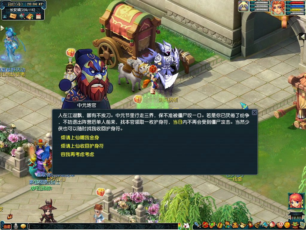 对阴阳两界之争感到疲倦的各位少侠,可以单人前往长安城中元地官(237,113)处领取护身符, 当日内将不会受到僵尸攻击。若想收回护身符,也可以随时找长安城中元地官(237,113)收回。