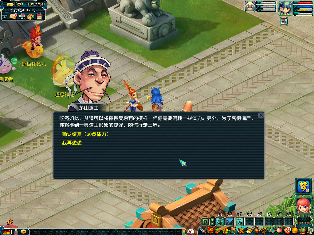对道士/僵尸形象不满意的各位少侠,可以前往长安城中元地官(237,113)处,消耗30点体力恢复原有的模样,同时,为了震慑敌对阵营,少侠还将得到一具当前阵营形象(道士/僵尸)的傀儡,跟随少侠行走三界。反之,想恢复阵营形象的少侠,也可以随时找长安城中元地官(237,113)恢复。