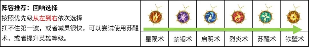 在回响的使用中,我们推荐按照以下的顺序选择。正常情况下我们会选择星陨术。假如对面控制较多也可以使用禁锢术,我方容易减员可以采用苏醒术等。