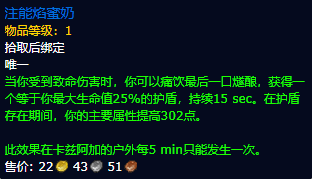 当你受到致命伤害时,你可以痛饮最后一口燧酿,获得一个等于你最大生命值25%的护盾,持续15 sec。在护盾存在期间,你的主要属性提高302点。
