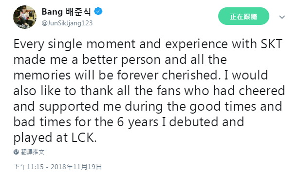 大家好,我是Bang,裴俊植。如你们所见,我决定离开SKT T1啦。过去的五年SKT生涯对我来说,是一段不可思议的旅程。我要感谢教练,感谢管理层,感谢队友,一同度过这美好时光。