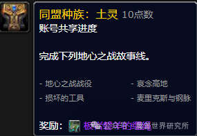 奖励除了能够创建土灵角色外,完成成就后玩家还将解锁新坐骑板岩磐羊的缰绳。对于想丰富坐骑收藏的玩家,可以创建土灵圣骑士,这将额外解锁他们的圣骑士种族坐骑土灵宣令者的磐羊。所需支线任务玩家需完成以下三个故事线中的支线任务:哀念高地: