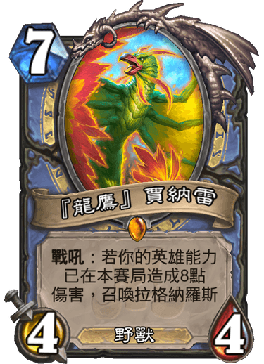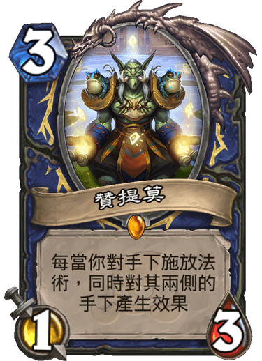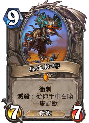 相信玩过魔兽世界熊猫人版本的玩家都对这张卡十分熟悉,作为一个破坏力十分的野外BOSS不知道曾是多数人的噩梦,还记得第一次打这个BOSS几个团的人一直拖尸都打不过。在炉石传说中同样也算是不错,977的身材拥有突袭和超杀的效果,触发超杀之后可以从手牌中召唤一只野兽,可以说在绝大多数情况下都是稳定召唤。可以把比作手牌版的冬灵,而且在很多情况下会召唤多次。