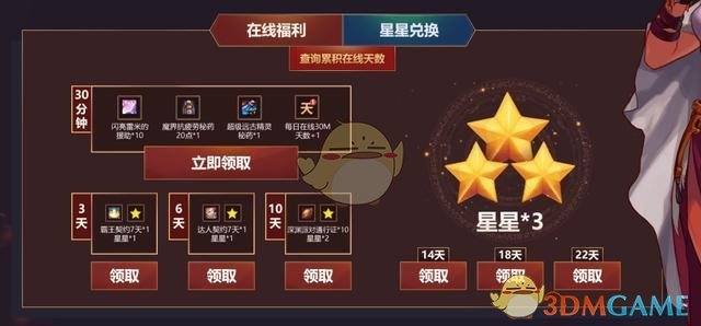 同样是每天在线30分钟就能领取雷米和疲劳药,3倍药水等,领取累计奖励获得星星可以用来抽奖或者获得深渊票,既然每日都玩这些奖励该领就领。