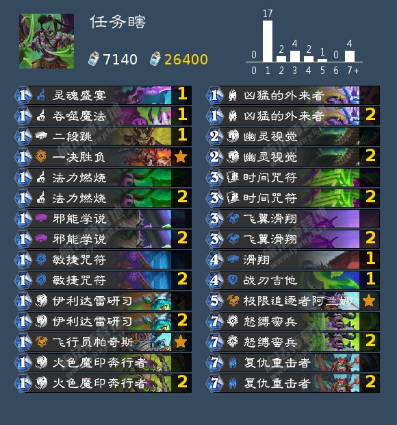 国服老将任务瞎重新登临天梯顶端,这套是目前非常热门的任务瞎构筑,新版本补充的极限追逐者阿兰娜解决了最后的终端问题,并且两张飞翼滑翔让任务瞎的起手调度难度再降一阶,其次是最新的优化【第二把战刃吉他→飞行员帕奇斯+灵魂盛宴】,让卡组的丝滑程度、爆发能力再上升了一个档次。