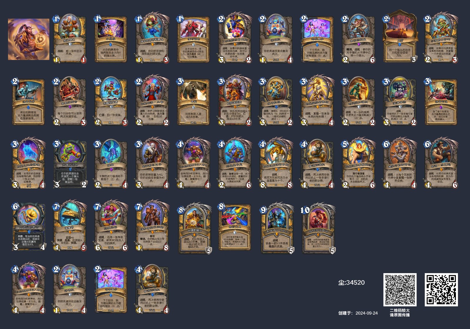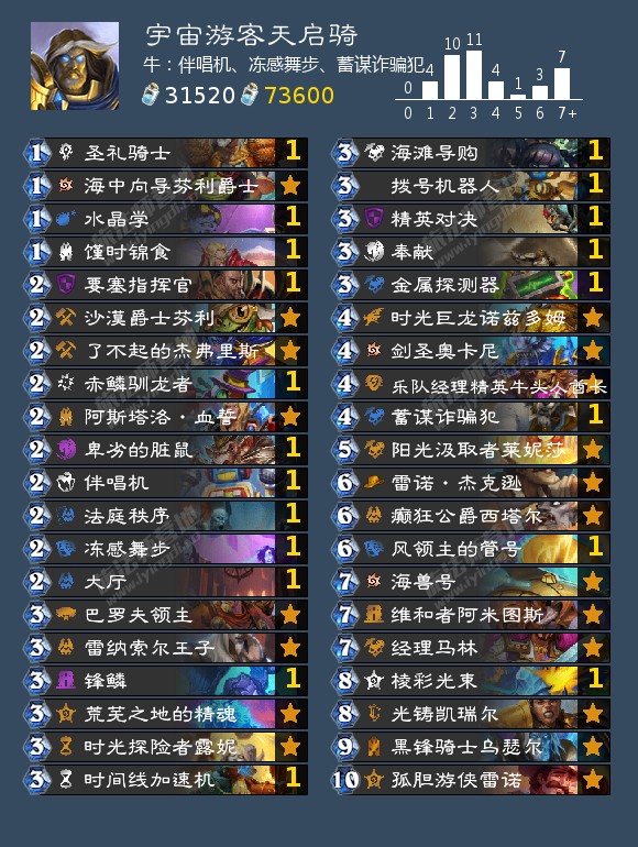传统随从版的宇宙天启,新加了潜行者游客阳光汲取者莱妮莎,从而能携带金属探测器、蓄谋诈骗犯、海滩导购、拨号机器人4张利于天启且本身就十分优秀的好牌。