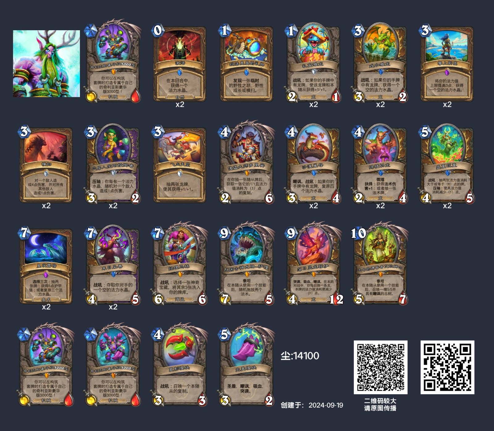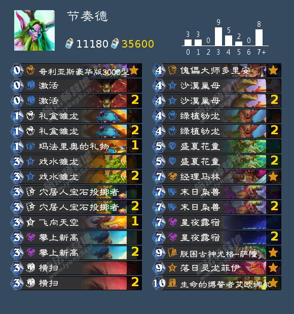 作为新手可以免费领取的卡组,这套节奏德已经相当成型和完善,强度也很高。卡组期望的前期节奏是一费礼盒雏龙,二费硬币戏水雏龙跳到四费或者三费戏水雏龙跳到五费,下回合沙漠巢母+其他卡稳住场面。此时如果对方场面压力不大,就可以靠盛夏花童抽到/直接打出末日枭兽吸水晶打出费用压制,达到高费打低费的效果。在这种节奏下,如果对方是慢速卡组,极难再解掉我方场面,被直接平推。如果没抽到枭兽或者让对方拖到了后期,每回合法强横扫+穴居人宝石投掷者解掉对方场面的同时造出十几点直伤,也能够赢下。卡组还有一个胡点就是沙漠巢母回合打出傀儡大师多里安,对方解不掉的话被接上盛夏花童抽牌,就能靠获得的一费复制打出巨大节奏。